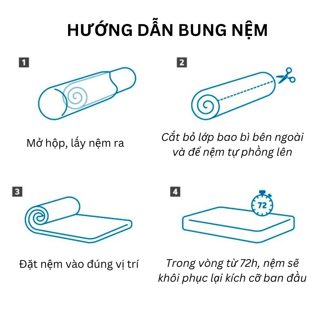 - Chỉ cần cắt phần túi nilon bao bọc bên ngoài, nệm sẽ tự bung ra và phồng dần lên. Trong vòng 72 giờ nệm sẽ khôi phục lại đúng với kích cỡ ban đầu.