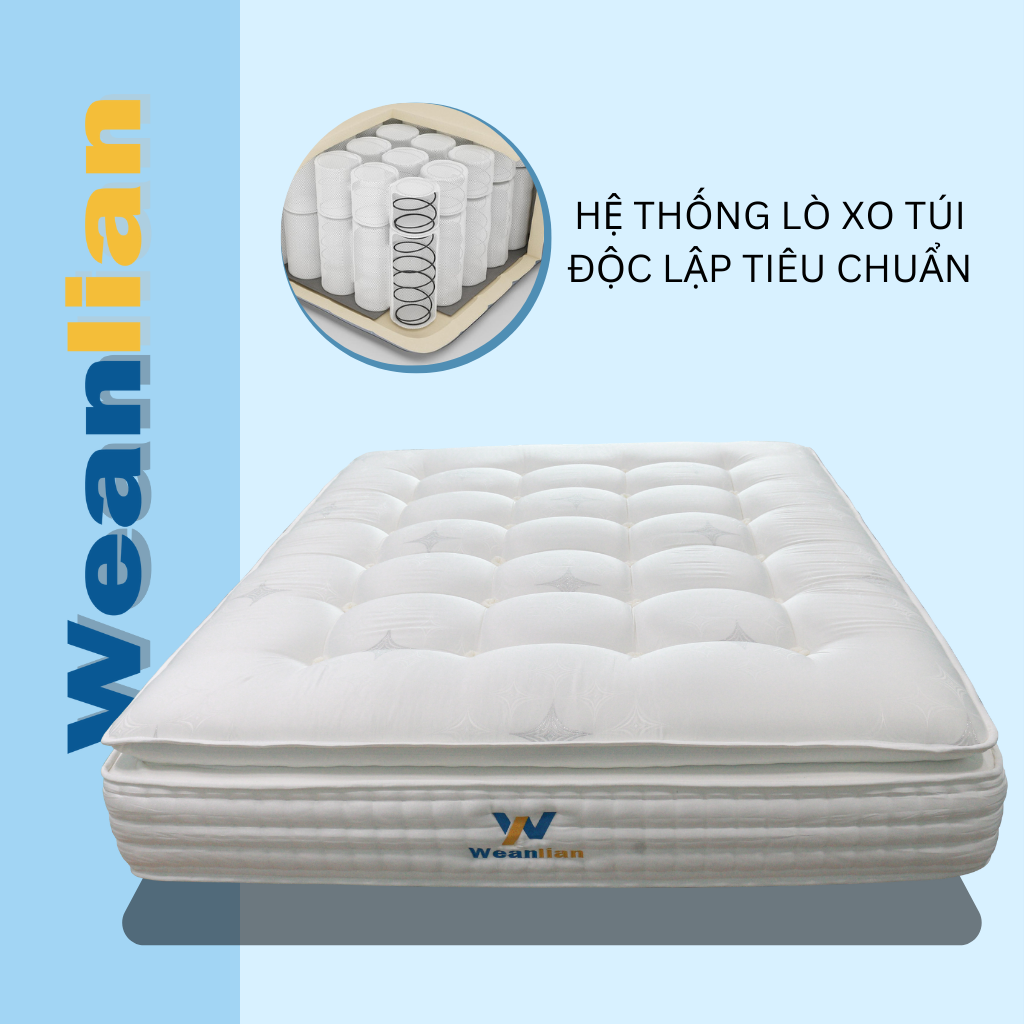 - Nệm lò xo Weanlian được tạo thành từ các lớp Poly, Foam, lò xo túi,...cao cấp được sắp xếp khoa học. Ở giữa là các lớp Foam tỉ trọng cao, kết hợp với hệ thống lò xo túi độc lập, tạo nên độ đàn hồi vượt trội.