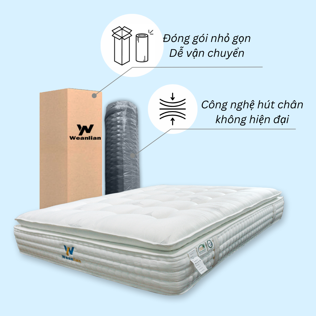 Weanlian là thương hiệu được yêu thích tại thị trường Mỹ nhờ nguồn sản phẩm đa dạng; chất lượng cùng chính sách giá cực kỳ hợp lý. Dòng nệm lò xo hút chân không tiện lợi có thời gian bảo hành lên đến 10 năm, hứa hẹn sẽ là lựa chọn tuyệt vời mang đến giấc ngủ vàng cho gia đình bạn.