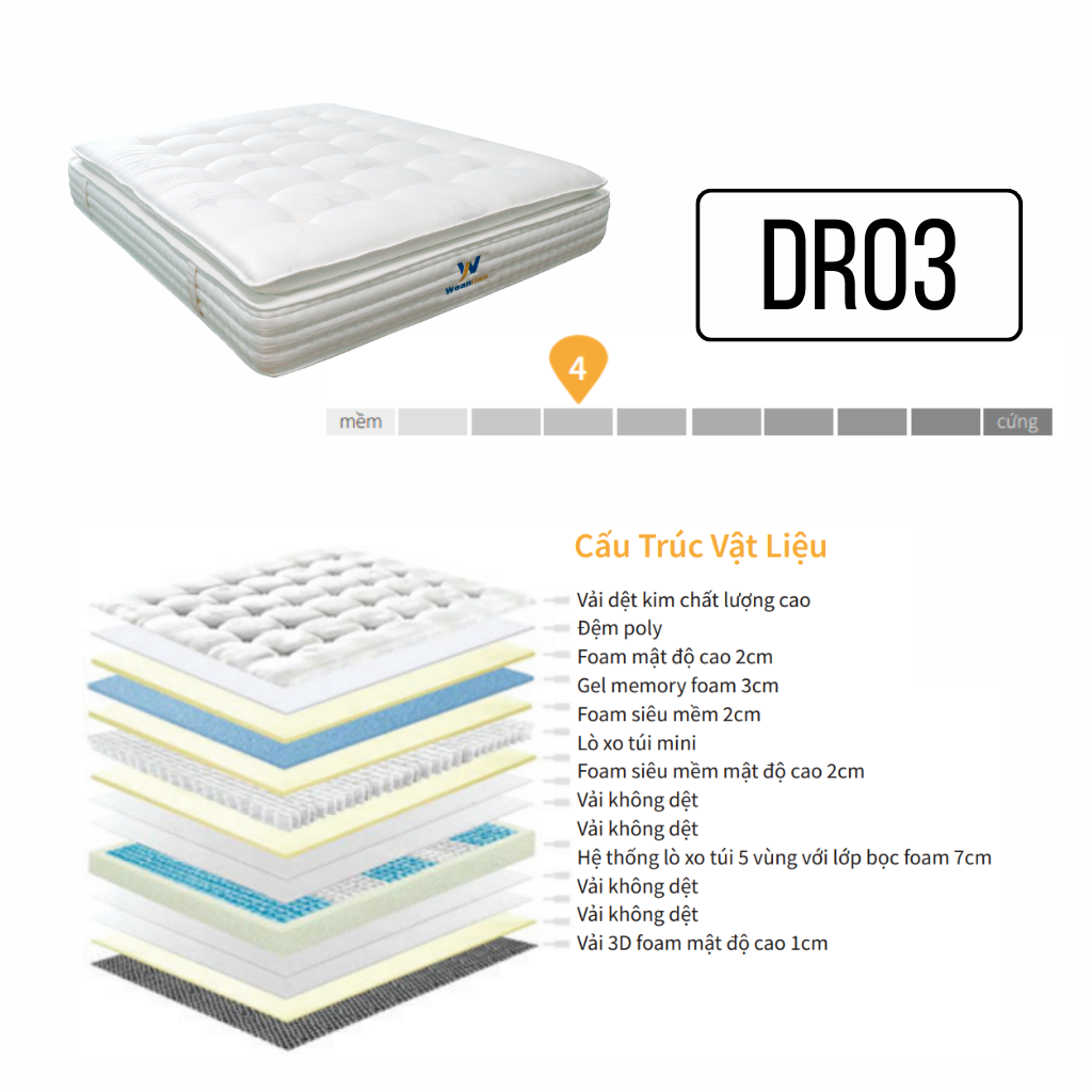 - Bên trên DR03 được tăng cường thêm lớp nệm poly tạo cảm giác bồng bềnh, thông thoáng, giảm đi cảm giác hầm nóng khi nằm lâu.