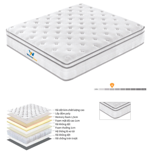 Hệ thống lò xo túi độc lập, Vải dệt kim chất lượng cao, Lớp đệm Poly, Memory Foam 1,5cm, Foam mật độ cao dày 1cm, 2 lớp vải không dệt, Foam thường 1cm, vải chống trượt |