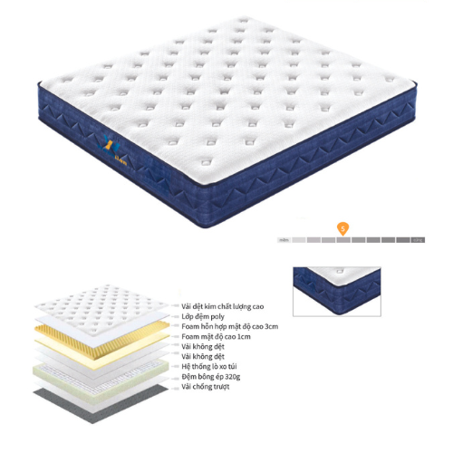 Lò xo túi độc lập Vải dệt kim chất lượng cao, Lớp đệm Poly, Foam hỗn hợp mật độ cao dày 3cm, Foam mật độ cao dày 1cm, 2 lớp vải không dệt, Đệm bông ép 320g, vải chống trượt |